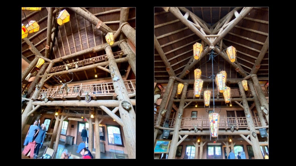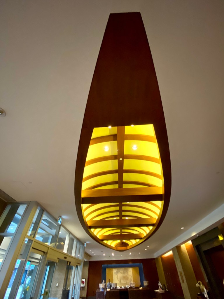 Hotel lobby – beautiful “canoe” accent in the ceiling and outlined in the carpet below (blue)