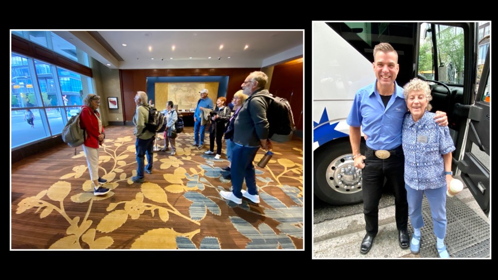 Gathering in the hotel lobby with our tour director (Heather) and bus driver (Nathan)