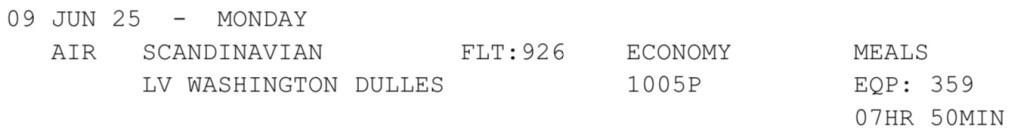 Non stop flight from Washington Dulles to CopenhagenChecked in and waiting at the gate for a 9:20 boarding and 10:05 departure
